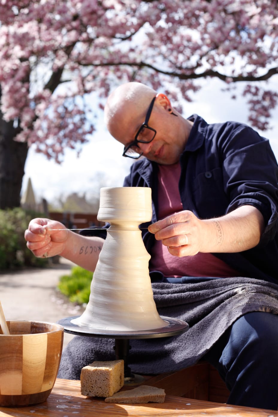 Die Keramik begleitet mich schon lange. Ich habe in Mazedonien als selbstständiger Töpfer gearbeitet und später als Geselle in verschiedenen Werkstätten. Während der Pandemie musste die Töpferei, in der ich damals arbeitete, ihr Geschäftsmodell neu ausrichten. In diesem Moment wurde mir klar: Vielleicht war es an der Zeit, meinen eigenen Weg zu gehen.